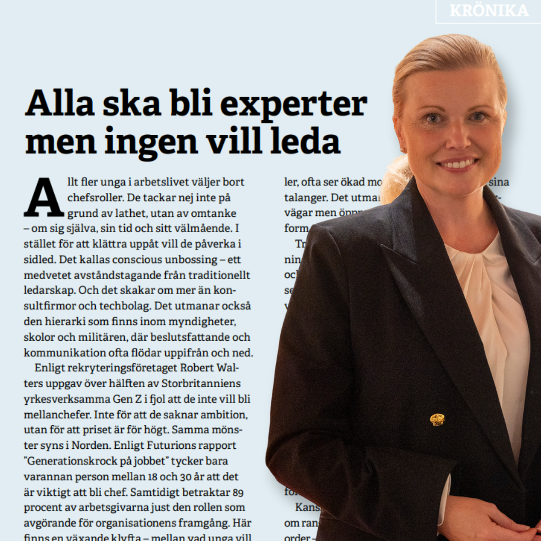 – om sig själva, sin tid och sitt välmående. I stället för att klättra uppåt vill de påverka i sidled. Det kallas conscious unbossing – ett medvetet avståndstagande från traditionellt ledarskap. Och det skakar om mer än konsultfirmor och techbolag. Det utmanar också den hierarki som finns inom myndigheter, skolor och militären, där beslutsfattande och kommunikation ofta flödar uppifrån och ned.”