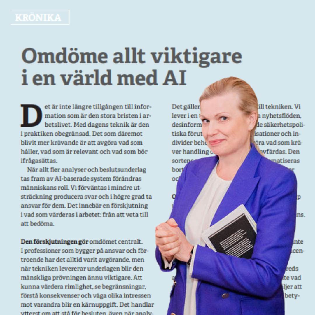 Ann-Therése Enarsson skriver om det som är allt viktigare i en värld med AI; mänskligt omdöme. Läs hela krönikan i Försvarbart nr 1,2026, s 30 »